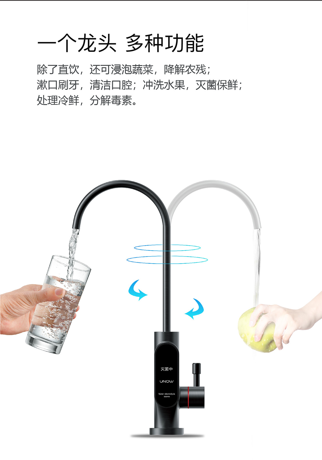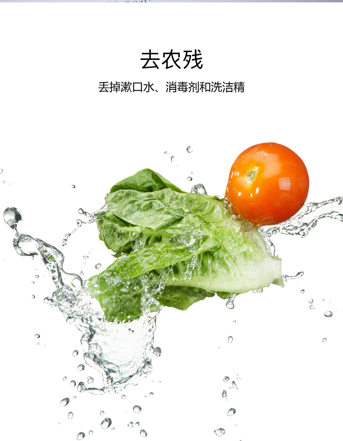 冲洗水果等食材10秒,快速杀 灭食材表面的各种细菌、病毒、 虫卵,降低食材中引起腐败的微 生物数量,有效延长食材保鲜期 |